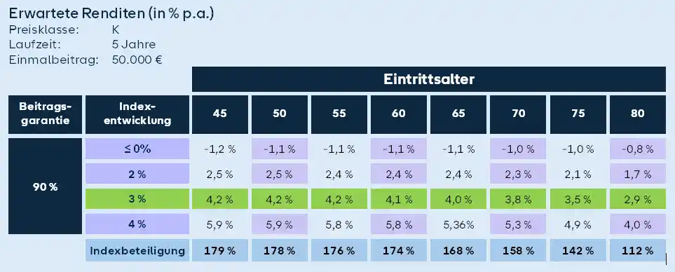 Zum Vertragsabschluss kann Ihr Kunde/Ihre Kundin zwischen einer 90%-igen und einer 100%-igen Garantie seines/ihres Einmalbeitrags wählen (garantiertes Vertragsguthaben). Die Garantie greift nach Ablauf der Indexphase, also zum planmäßigen Rentenbeginn - Garantierte Mindestrente