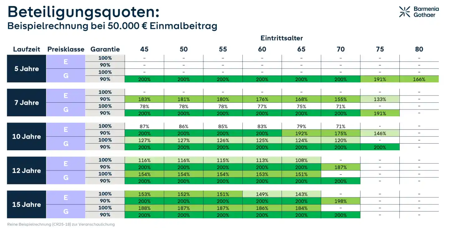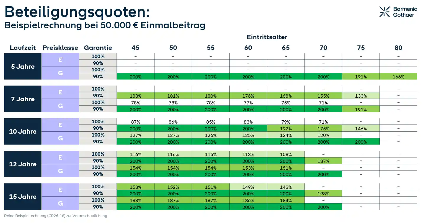 Besonderes Highlight: Diese Quote kann bis zu 200% betragen und bleibt über die gesamte Laufzeit gleich hoch. Der gesamte Einmalbeitrag wird auf Basis der Beteiligungsquote an der positiven Wertentwicklung des gewählten Index beteiligt!