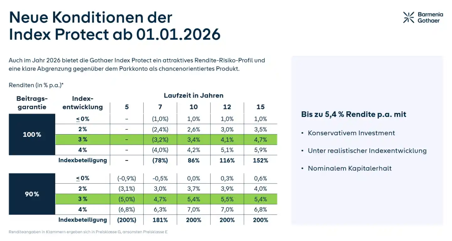 Ab dem 01.01.2026 öffnen wir unsere Index Protect mit 90% Beitragsgarantie in Preisklasse K für kurze Laufzeiten ab 5 Jahren und geben Ihnen eine neue attraktive Option in der Beratung Ihrer Kundinnen und Kunden an die Hand.